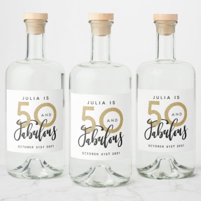 Celebrate your 50th birthday in style with these black and gold effect 50 and fabulous birthday party labels. A modern design with script text and bold graphics. Change the colour to customise. Part of a collection. myWineLabel