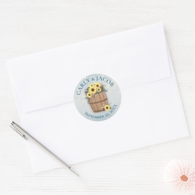 Re-purpose wine barrel full of beautiful yellow sunflowers baby's breath woodland twigs and pine cones perfect combination for a late summer or fall wedding when the sunflowers are in full bloom. Blue wood look background with delicate string lights add just enough accent to this lovely rustic country sticker for weddings and bridal showers. myWineLabel