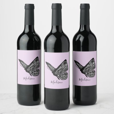 Wine label with a beautiful black and white butterfly with embellished wings. The embellishment consists of various ornaments and patterns. The design is customizable and you can personalize the text. myWineLabel