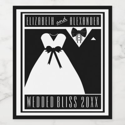This black and white retro abstract style wine bottle label will impress your wedding guests. Wine makes a perfect wedding guest favor or use on reception tables. An abstract white bridal gown and a black tuxedo with bow tie. Bride and groom's names are personalized with "Wedded Bliss" and year. Customize all font and text. To see more wonderful wedding products Please visit "The Hungarican Princess - A Boutique" at zazzle.com/hungaricanprincess. Congratulations. myWineLabel