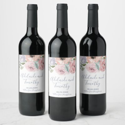 These dusty rose florals wedding wine labels are perfect for a spring or summer wedding reception. The romantic floral design features lilac purple blush pink and peach flowers arranged in a gorgeous soft pastel bouquet. Personalize the wine bottle stickers with the names date and location. These labels can be used for the wedding reception rehearsal dinner engagement party or simply change the wording to suit any celebration. myWineLabel