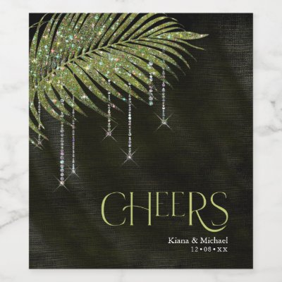 Evoke a moody summer night in the tropics with jewels cascading off diamond-encrusted palm leaves or delete the jewel layers for a slightly more conservative look. This set features shimmering leaves and textured background in shades from light olive to dark seaweed green. This set features shimmering leaves and textured background in shades from light olive to dark seaweed green. The wedding wine label shown here has a upper border of sparkling leaves elegant 'Cheers' text and the bride and groom's names and wedding date. Easily enter your details using the provided template. View the collection link on this page to see all of the matching items in this beautiful set or search ID830 to see additional color options for this design. myWineLabel