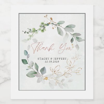 Design features hand painted eucalyptus floral greenery with gold accent and Thank You in a gold glitter calligraphy script. Easily customize names and event date of choice. An ideal compliment to your wedding stationery party favors bridal shower gifts and more. Check out our matching items in our Design Curve Studios shop. myWineLabel