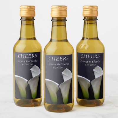 White calla lilies on black wedding wine label