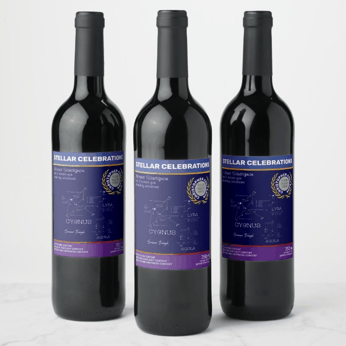 A set of 29 customizable wine labels on the theme of Zodiac and some other star constellations. Good for birthdays and celebrations. Navy blue color of the outer space. The colors of the stars are roughly real. #wine #label #Zodiac #star #constellation #custom #birthday #celebration