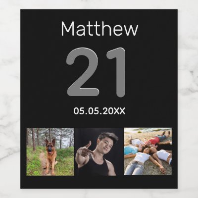 For a 21st birthday party. A collage of 3 of your photos of himself friends family interest or pets. Personalize and add his name age 21 and a date. Date of birth or the date of the birthday party. Gray and white colored text. Black background. myWineLabel