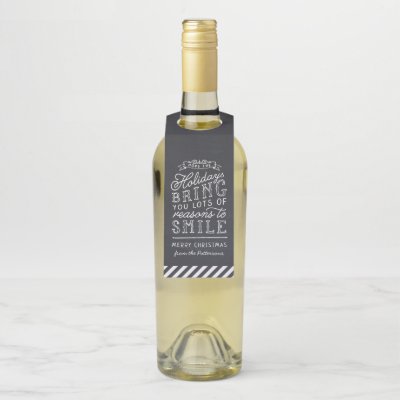 Custom printed wine bottle holiday gift labels. This fun design features cute hand-lettered style typography on a faux chalkboard background. The text reads "Hope the holidays bring you lots of reasons to smile". Personalize it with your name or other custom text. Use the design tools to edit the text add photos and create a unique one of a kind holiday wine bottle gift tag. myWineLabel