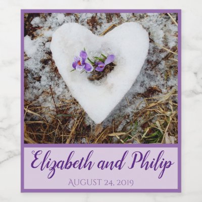 This beautiful elegant classic and modern wedding invitation features a photograph of spring crocuses in winter's last snow shaped into a cute heart. I accented the invitation with shades of purple but it would also look good with blue pink yellow or gray. This is a perfect invitation for a rustic mountain or outside wedding especially set in winter or spring. Very easy to customize. This wedding invitation is part of the Spring crocus in snow heart wedding collection. It contains everything you need to easily create a luxe wedding stationery suite at a very affordable price. You should see a link to it on this page. If you don't see the link or need help with an item please contact me. This design would also work for an engagement RSVP save the date or anniversary party. myWineLabel