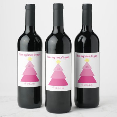 Feeling the need for a less traditional bit of holiday color? Hot pink and white more your style this year? This sweet little tree in monochromatic shades of pink with a shining yellow star at the top brightens the party with a fun colorful feel and a customizable typographical message of "From my house to yours." Perfect gift from or to single women especially hostesses and hosts friends family coworkers volunteers neighbors teachers nurses doctors - or your own home. Message on label easily customized to your own - just click to personalize it. Look in my store for matching personalized holiday items including a matching personalized wine gift bag and Christmas cards. myWineLabel