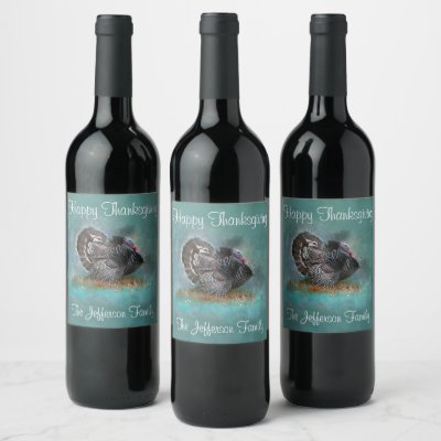 Ad: Happy Thanksgiving Teal Turkey Family Name Wine Label