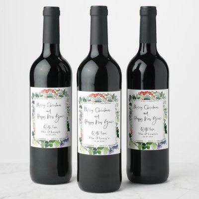 Design features Red holly berries and green botanical leaves with a Merry Christmas and Happy New Year in a modern brush script. myWineLabel